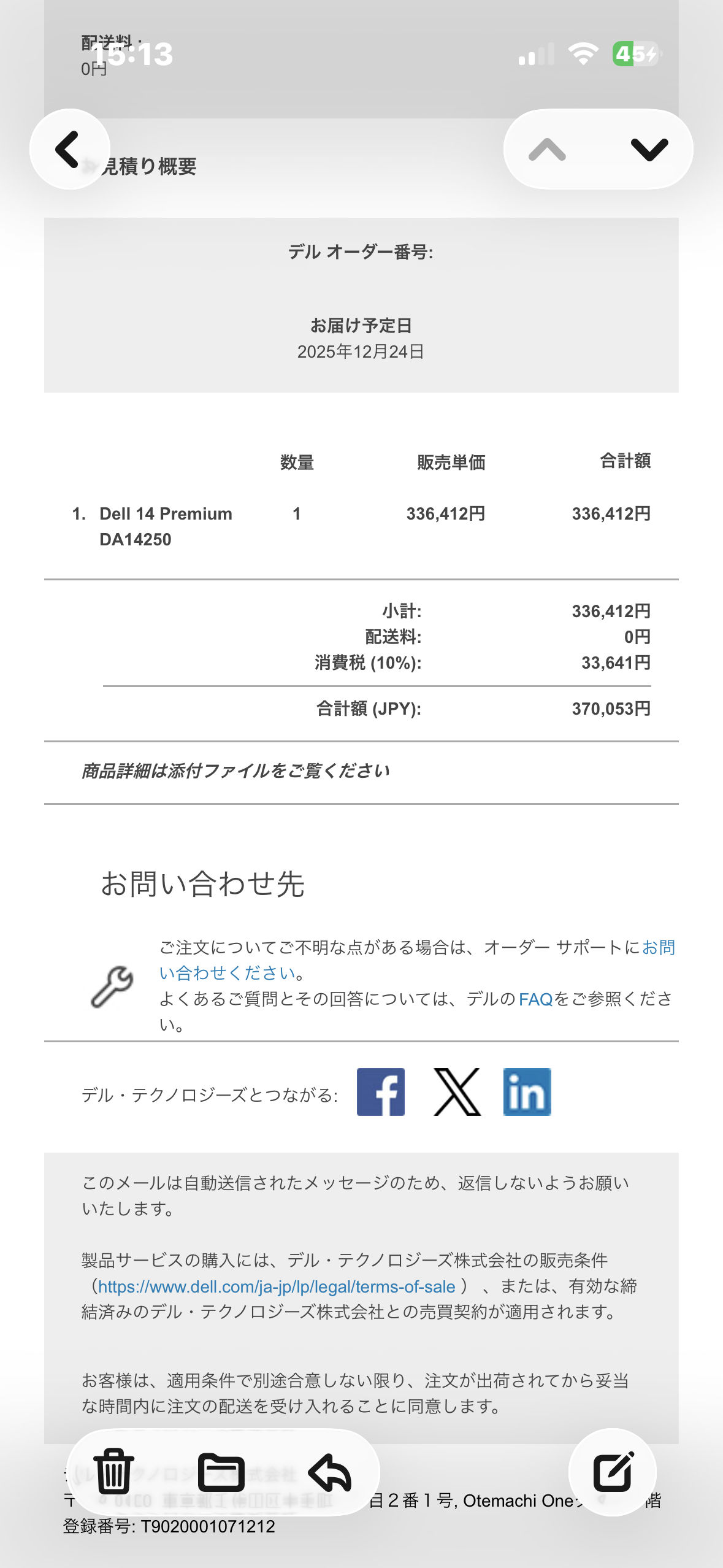 という訳で 12 月 8 日に そのままの構成で発注となりました。 Dell は受注生産なので そこから組み立てて工場出荷が 11 日, 海の向こうでの話なので, そこから少し日を経たクリスマス前の 12 月 21 日に届いています。 いや, 当時国内外に拘わらず運送遅れが かなり発生していて, さらにメモリ等の高騰を受けて「運送中に本体は勿論メモリやストレージを抜かれる」といった案件も発生したりと, 当時実は少しだけヤバい状況でした。 いや, 当たりくじを引くときは引きますからねぇ。 (^^;)