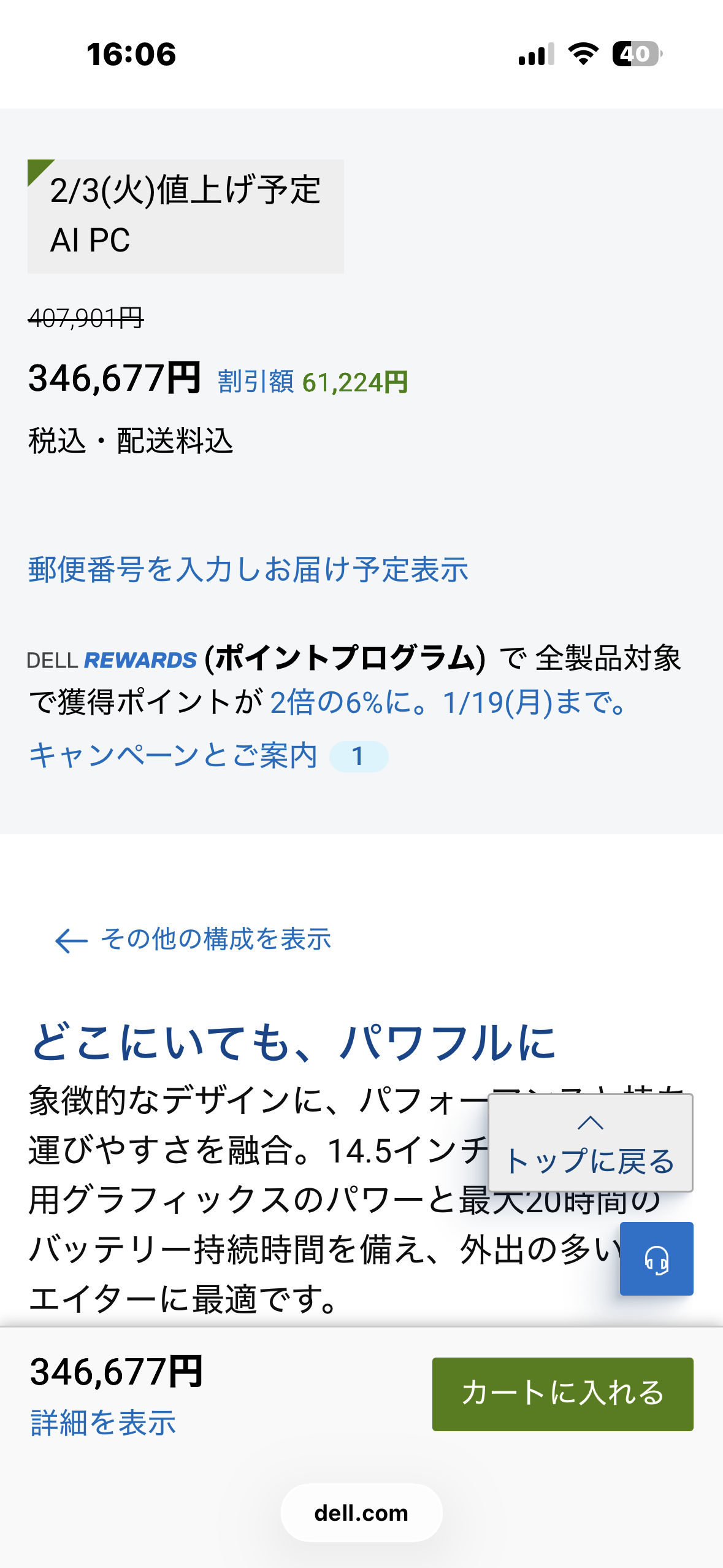 年明けともなると手を出しやすい製品から売れて, 左画像のように どんどん在庫がなくなっています。 そして中画像のとおり 1 月 14 日には 2 週間早い翌週 20 日からの値上げが決定しました。 12 月上旬までに買っておいて大正解でした。 年明けだと たとえセールが行われていても肝心のブツが在庫切れになっているところでした。 因みに, 中画像の 407,475 円な製品は GeForce RTX 4050 な 32GB RAM モデルです。 そう, 既に私が買った選択肢は在庫切れとなっています。 そして 1 月 20 日の右画像…値上げの結果は 548,700 円です。 以前の定価が 407,900 円でブラックフライデーなら 342,937 円でしたから, 20 万以上高い勘定です…もう 1 台買えますね。 (^^;)