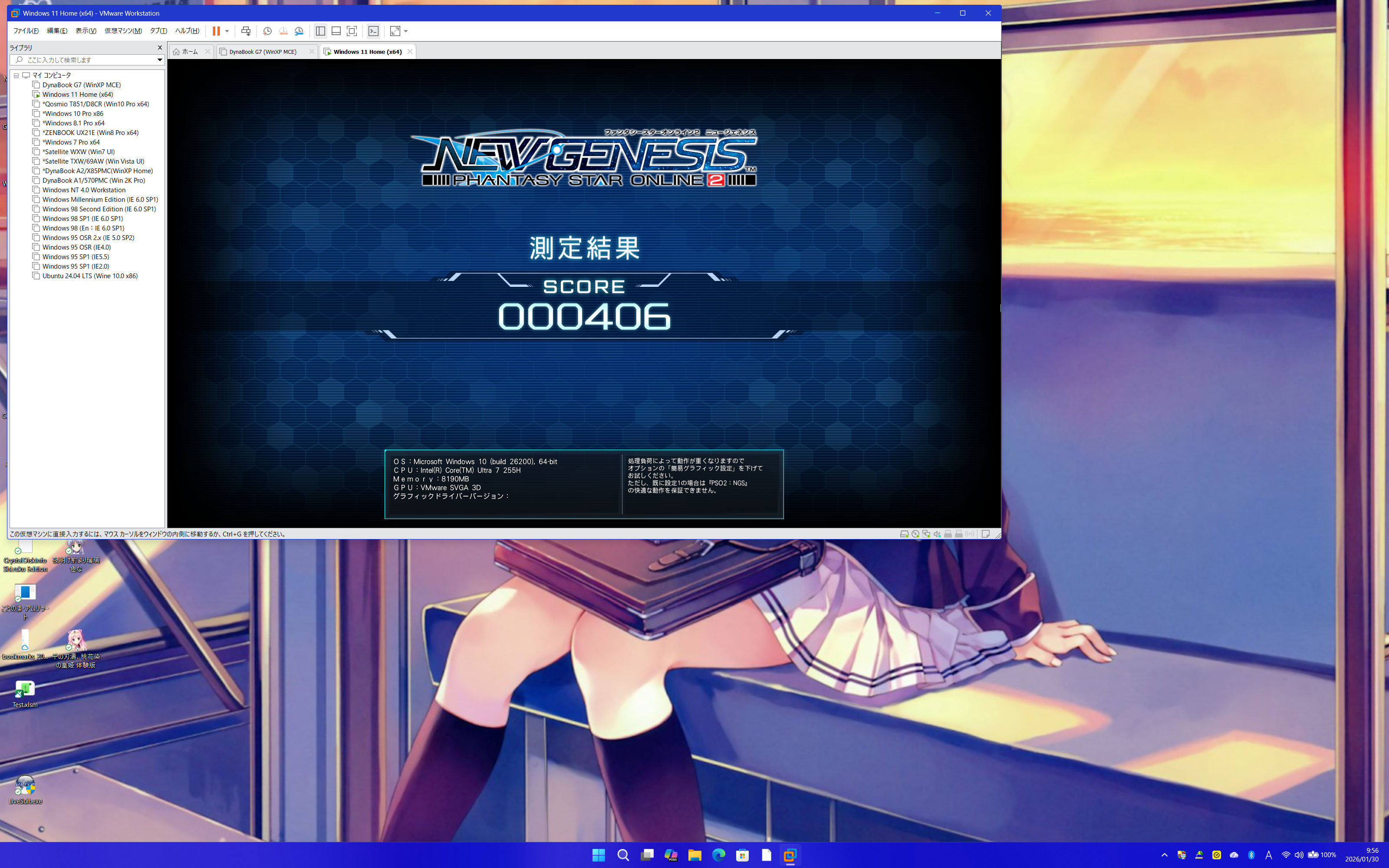Windows 11 ゲストでのベンチの結果は, 3DMark06 と 11 が それぞれ 24053 と P9603, タイムリープぶーとべんちと PSO2 ベンチが それぞれ 166 FPS と 406 でした。 昔は下手をするとホストの 8~9 割なスコアを叩き出したのですが, 現行では半減なダブルスコアになってしまうようです。 なお, 別記事で書きますが, Windows 11 ゲストは (ゲストの) TPM のせいで全体的に動作が遅くなっています。 要はハンデ付きな訳で, そういった意味でゲーム目的などには向きません。 いや, 今となっては Win 11 しかサポートされない訳ですけれども…。 あ, FFXIV ベンチは GPU 決め打ち仕様なので仮想 PC では動作しません。 例のエラーで門前払いを食らいます。 (笑)